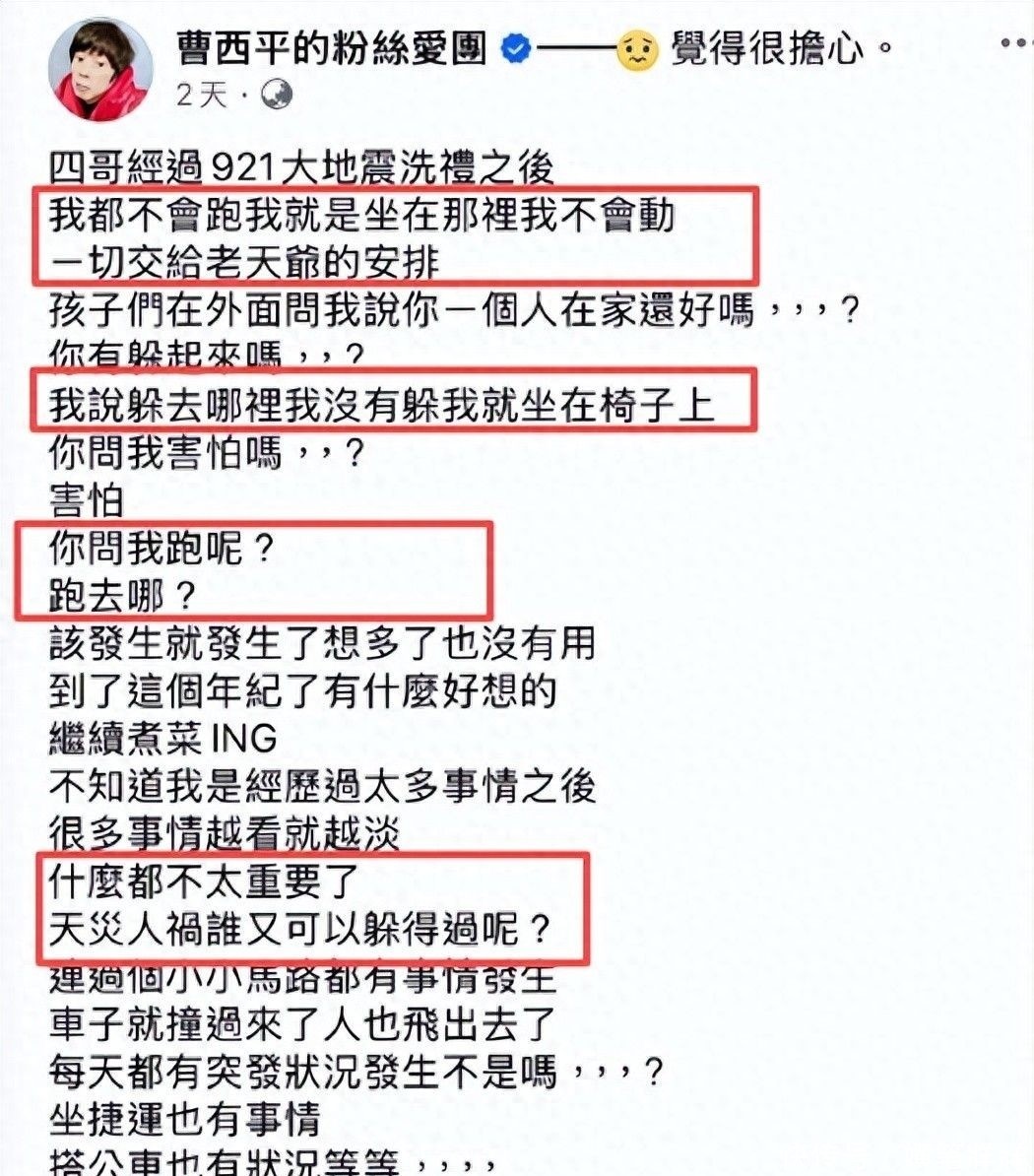 12月27日,台湾宜兰县海域发生6.6级强震,曹西平所居住的公寓受到明显晃动影响。次日他在脸书更新动态,并回复了几位粉丝留言。