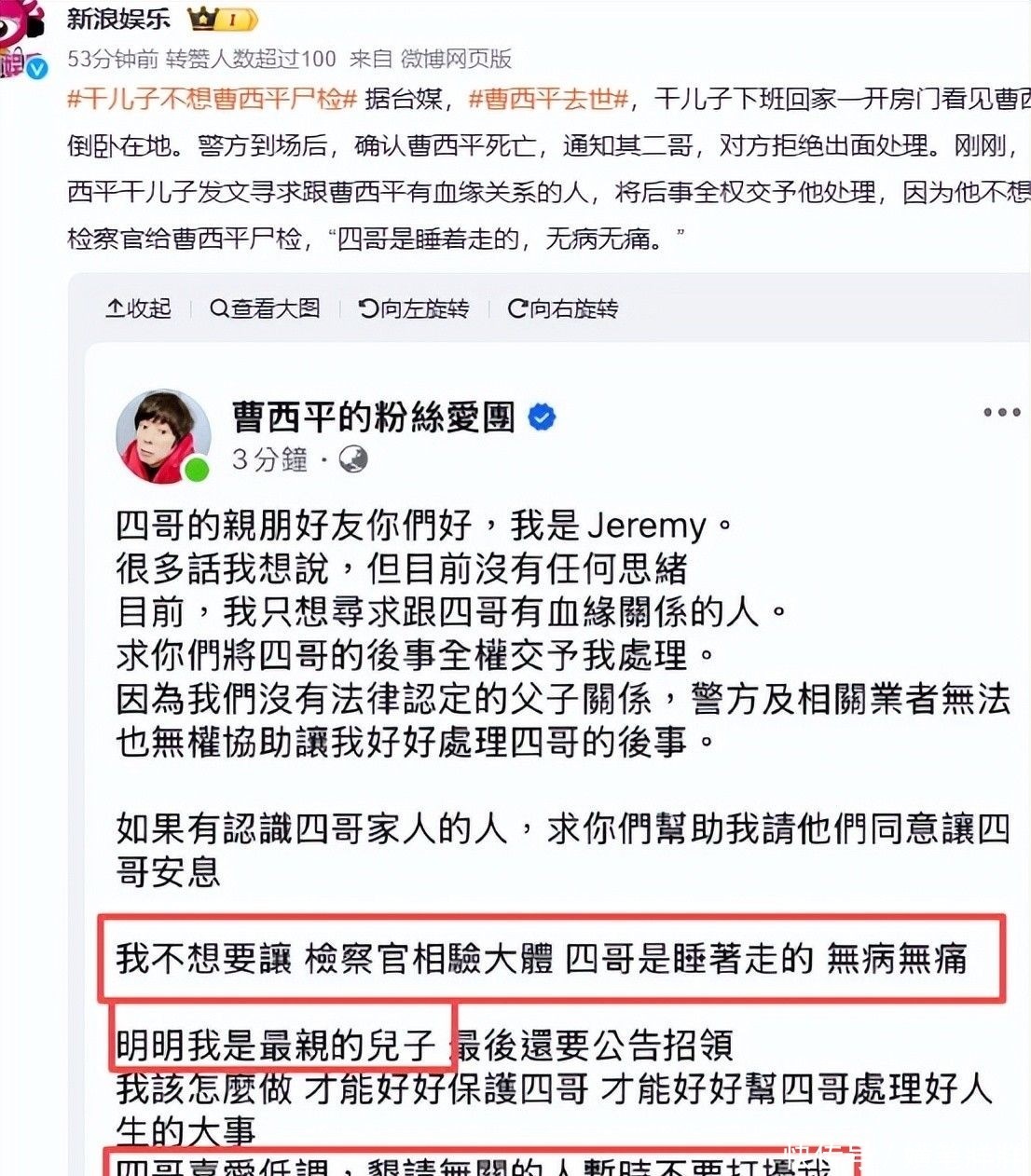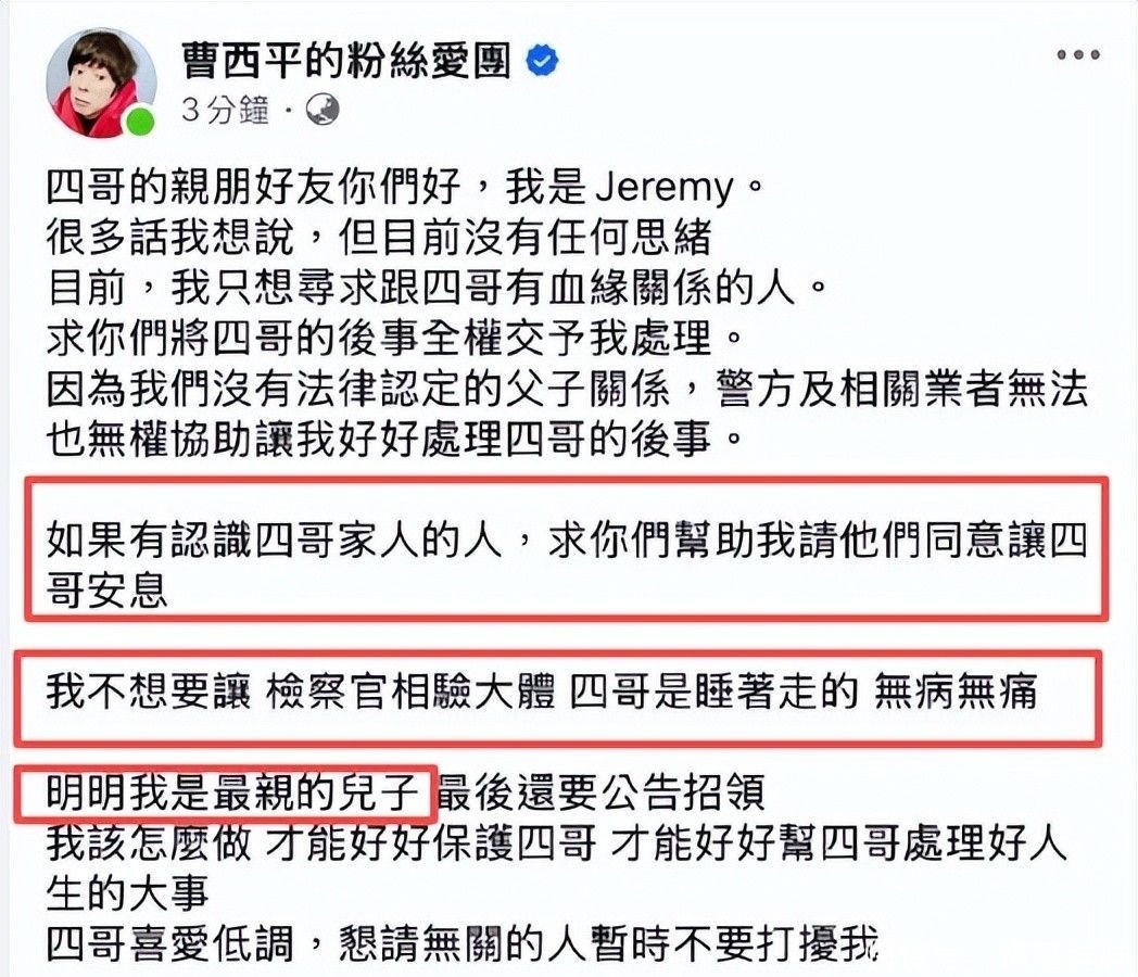 事实上,曹西平早有安排。生前立下遗嘱,明确将其名下所有资产(含台湾房产与存款)全部赠予Jeremy。