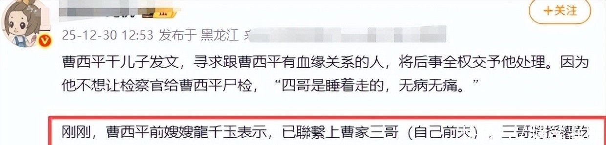 这篇求助迅速在网络扩散,曹西平的前嫂嫂龙千玉(本名江玉琴,曾嫁与其三哥曹南平)看到后主动联络前夫。