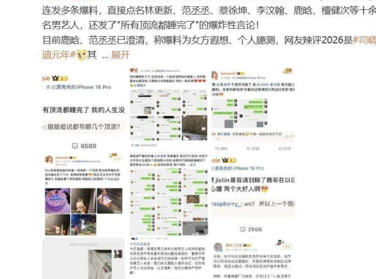 顶流们的反制手段也在进化。蔡徐坤、王安宇等12家工作室集体启用“区块链存证”,爆料秒删也能固定证据;微博豆瓣连夜上线“造谣预警”系统,关键词一响帖子当场冻结。但这依然挡不住司晓迪们的进攻——当她抛出鹿晗侧脸照和周奇开房记录时,粉丝控评速度永远追不上新料曝光节奏。更讽刺的是,吴亦凡案后建立的“明星法律声明模板”,如今成了粉丝口中的“心虚铁证”,网友嘲讽:“声明写得越硬,塌房速度越快。”